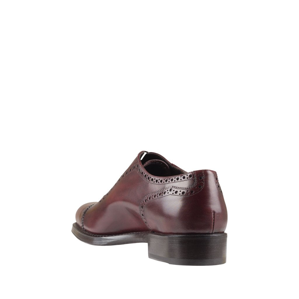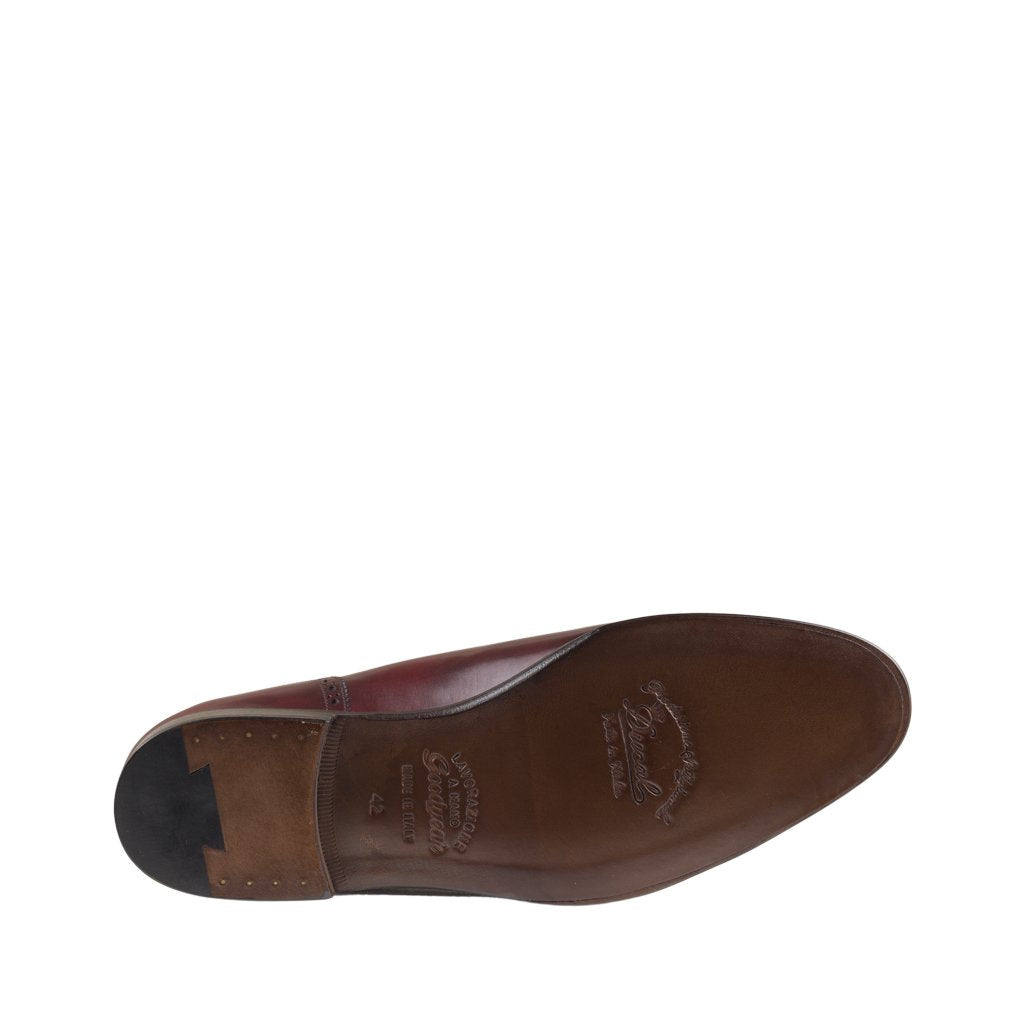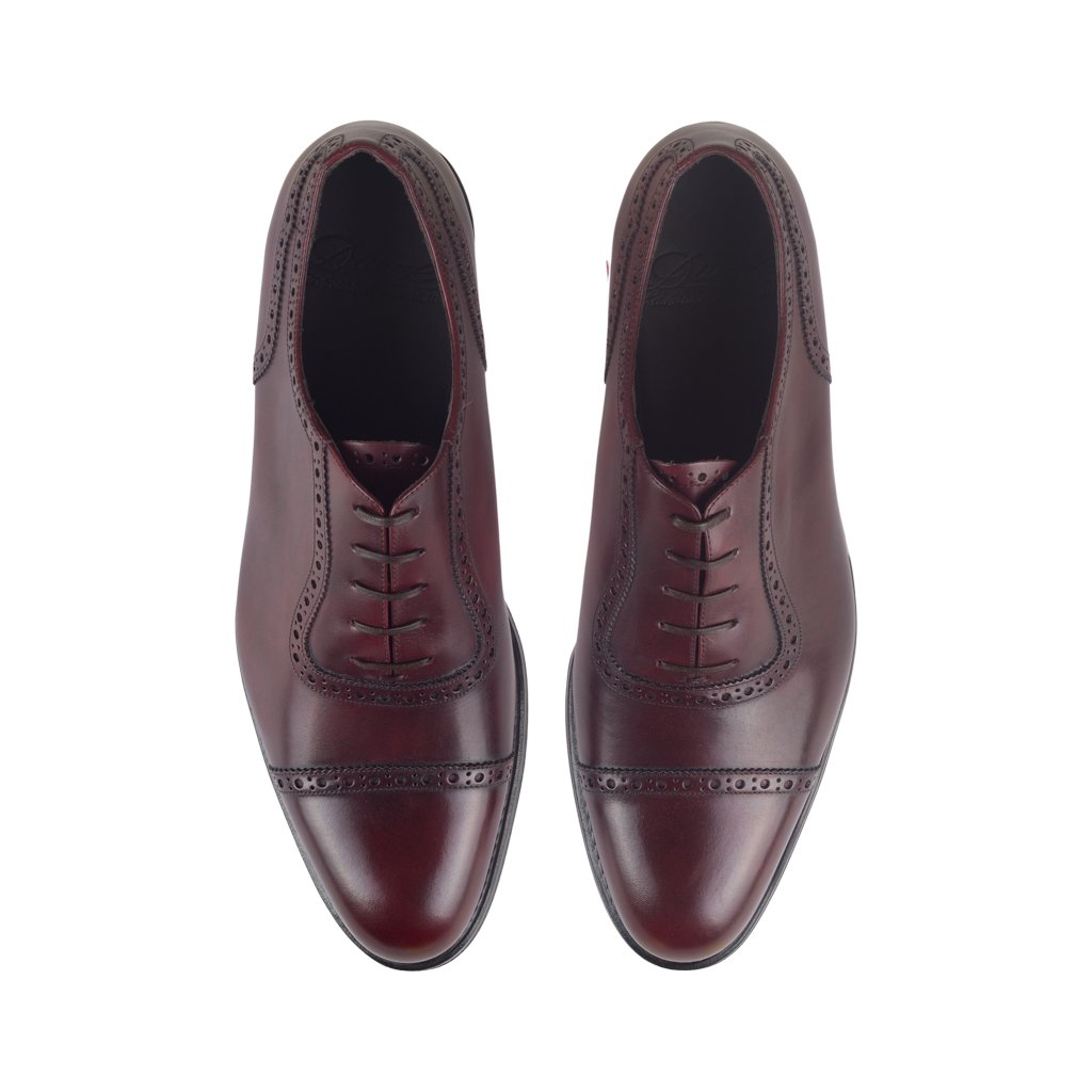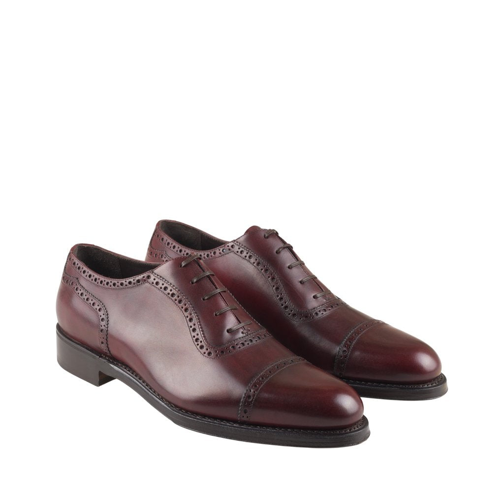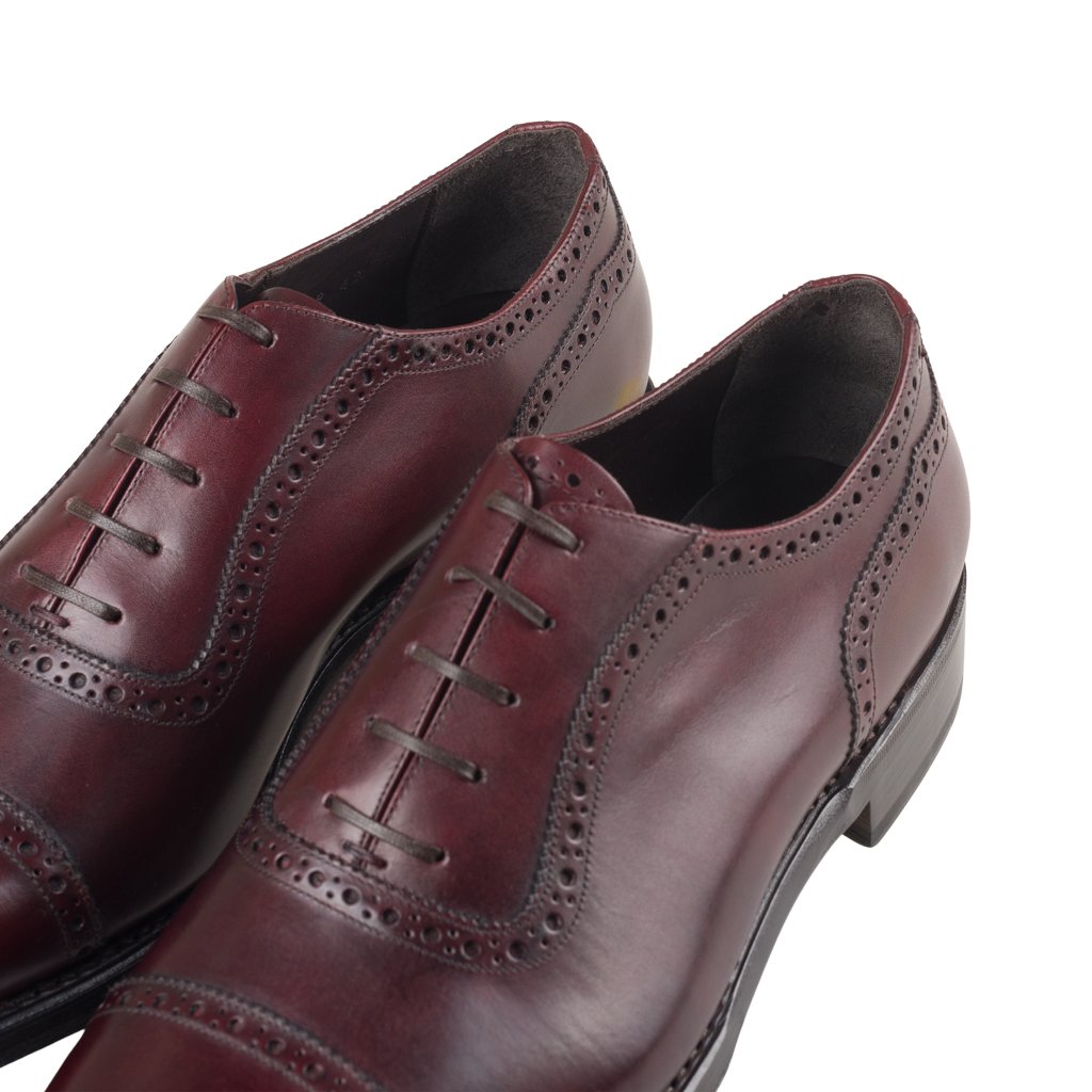Angelo is a classic oxford shoe handcrafted by Ducal in Florence, Tuscany. It has 5 holes with flat waxed laces and brogue details. The upper is in buffered calfskin, with a typical antique look, in a warm Burgundy color, the lining is in soft calfskin. It features a Goodyear construction with a double leather sole and hand-stitched welt. This method guarantees exceptional characteristics, made to last and to be absolutely balanced and comfortable. The processing allows the shoe to be resoled ensuring a long life.