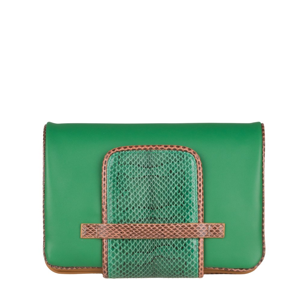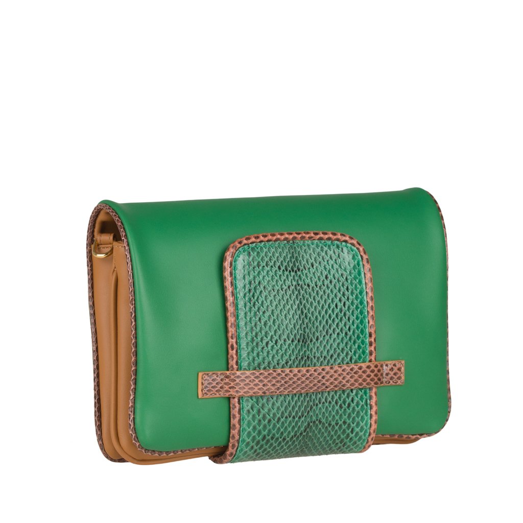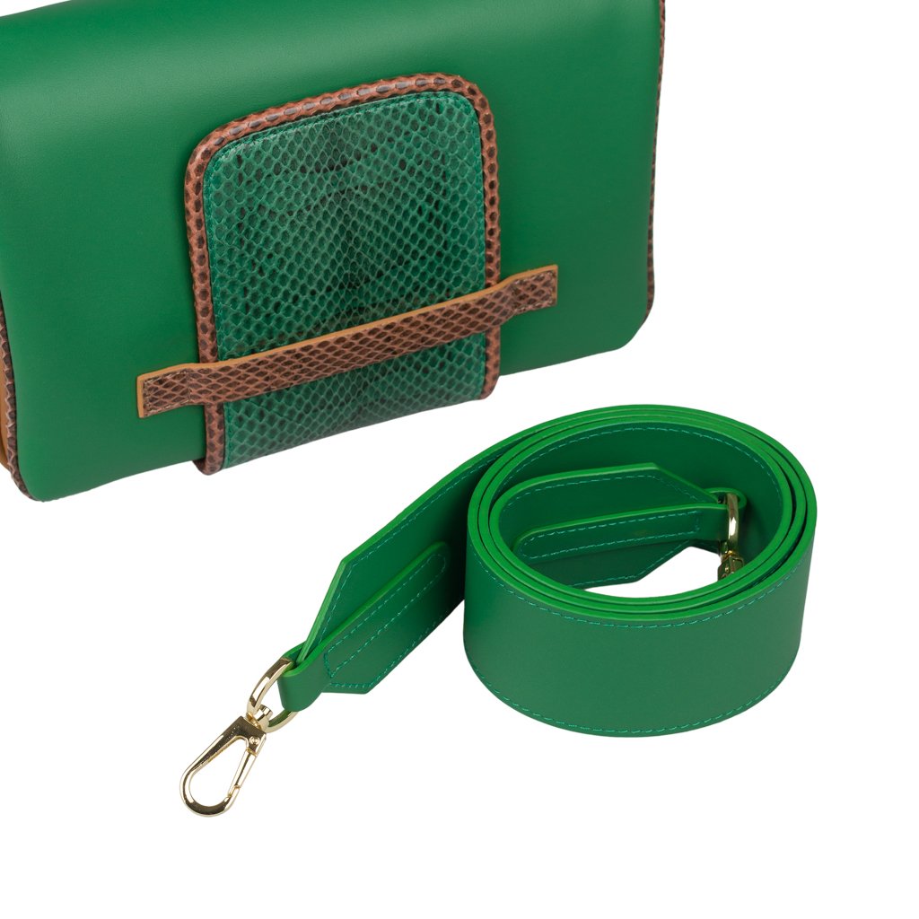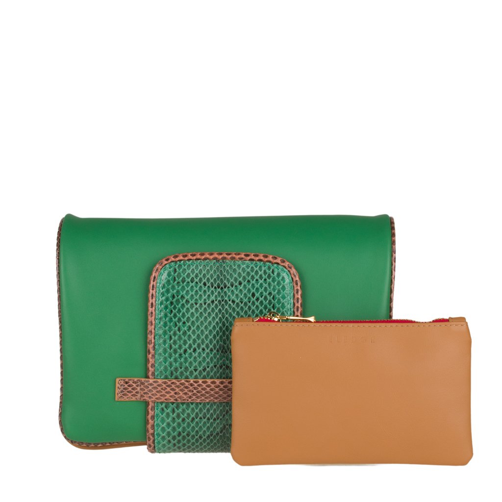 Annarella is a clutch bag crafted by ELEDOR in Padua, Veneto. With its Ayers snakeskin details and full grain bovine leather exterior, this luxuriously soft and super edgy clutch is the perfect accessory for the girl who loves to make a statement. If you prefer to go hands-free, attach the leather strap and wear Annarella as a crossbody. Either way, you'll surely make an entrance with this bag!