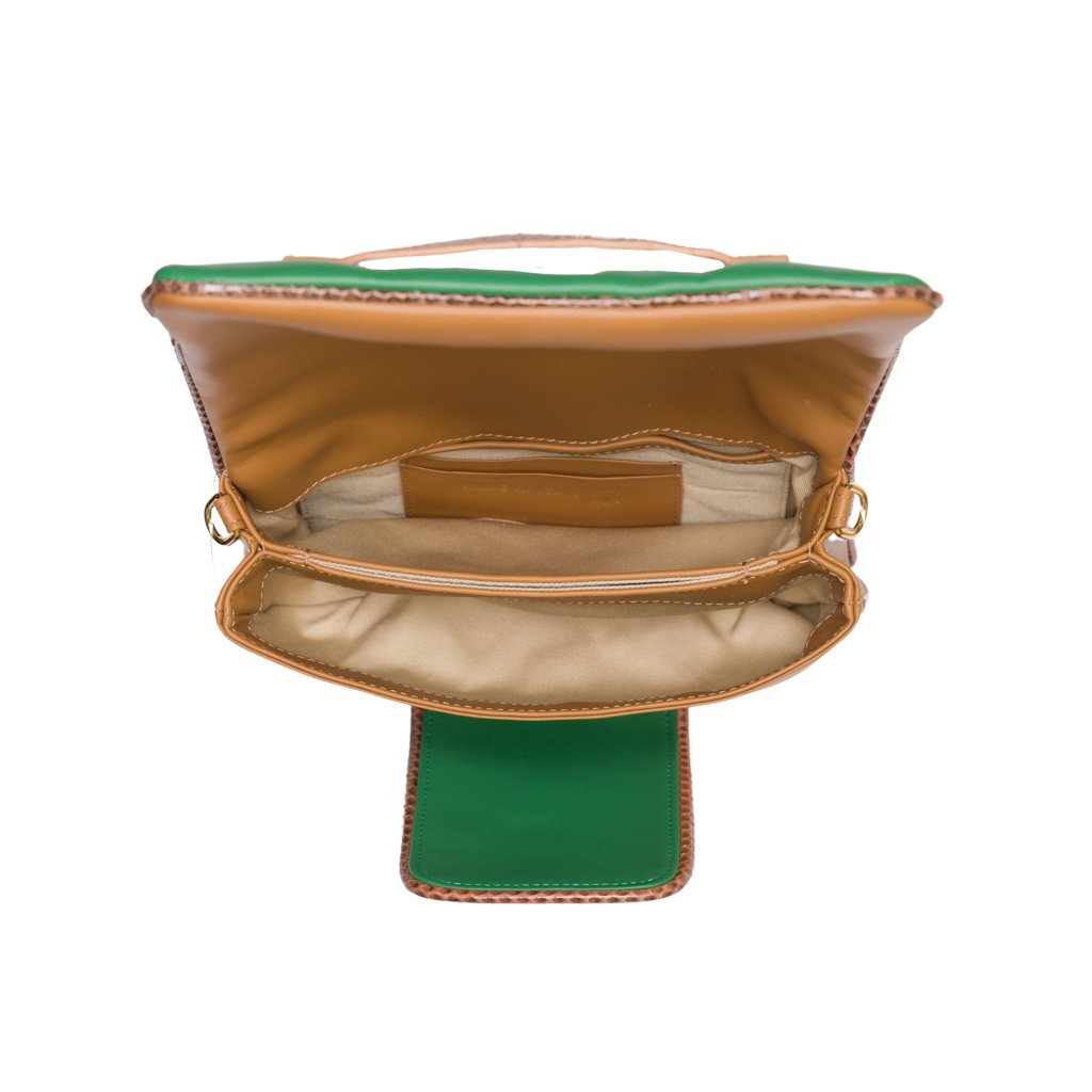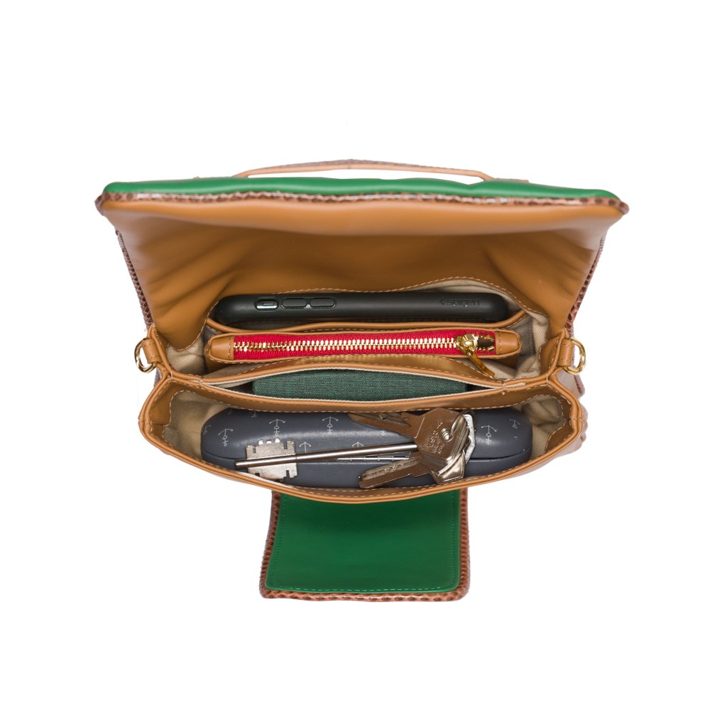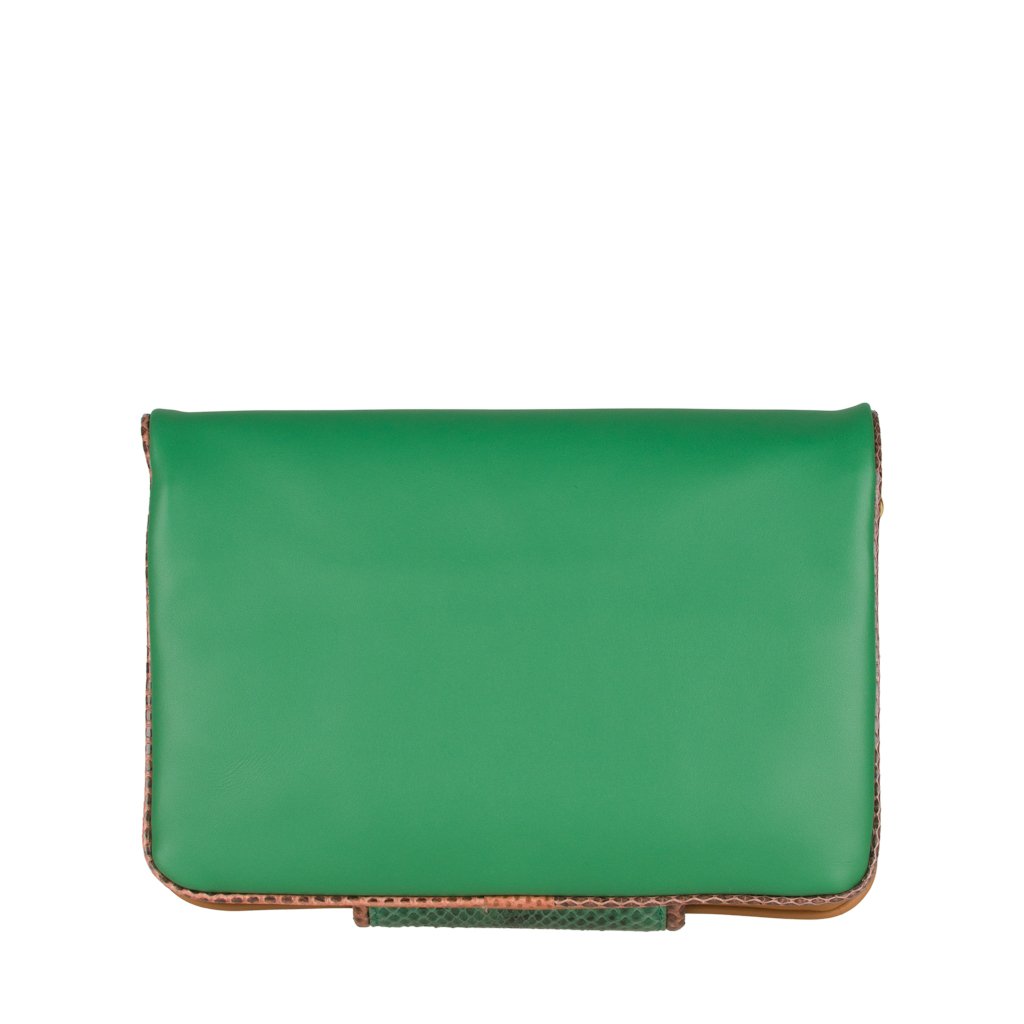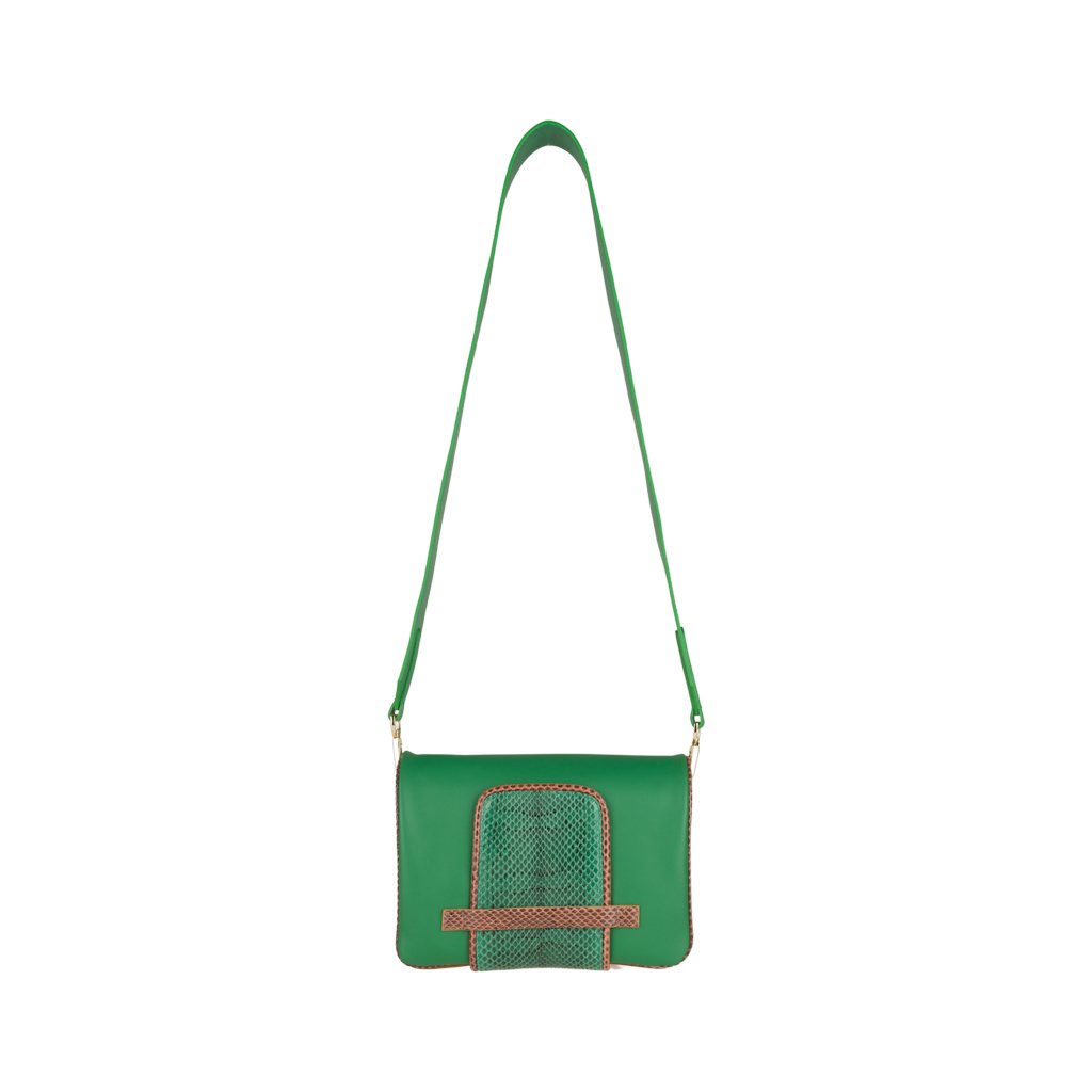 Annarella is a clutch bag crafted by ELEDOR in Padua, Veneto. With its Ayers snakeskin details and full grain bovine leather exterior, this luxuriously soft and super edgy clutch is the perfect accessory for the girl who loves to make a statement. If you prefer to go hands-free, attach the leather strap and wear Annarella as a crossbody. Either way, you'll surely make an entrance with this bag!