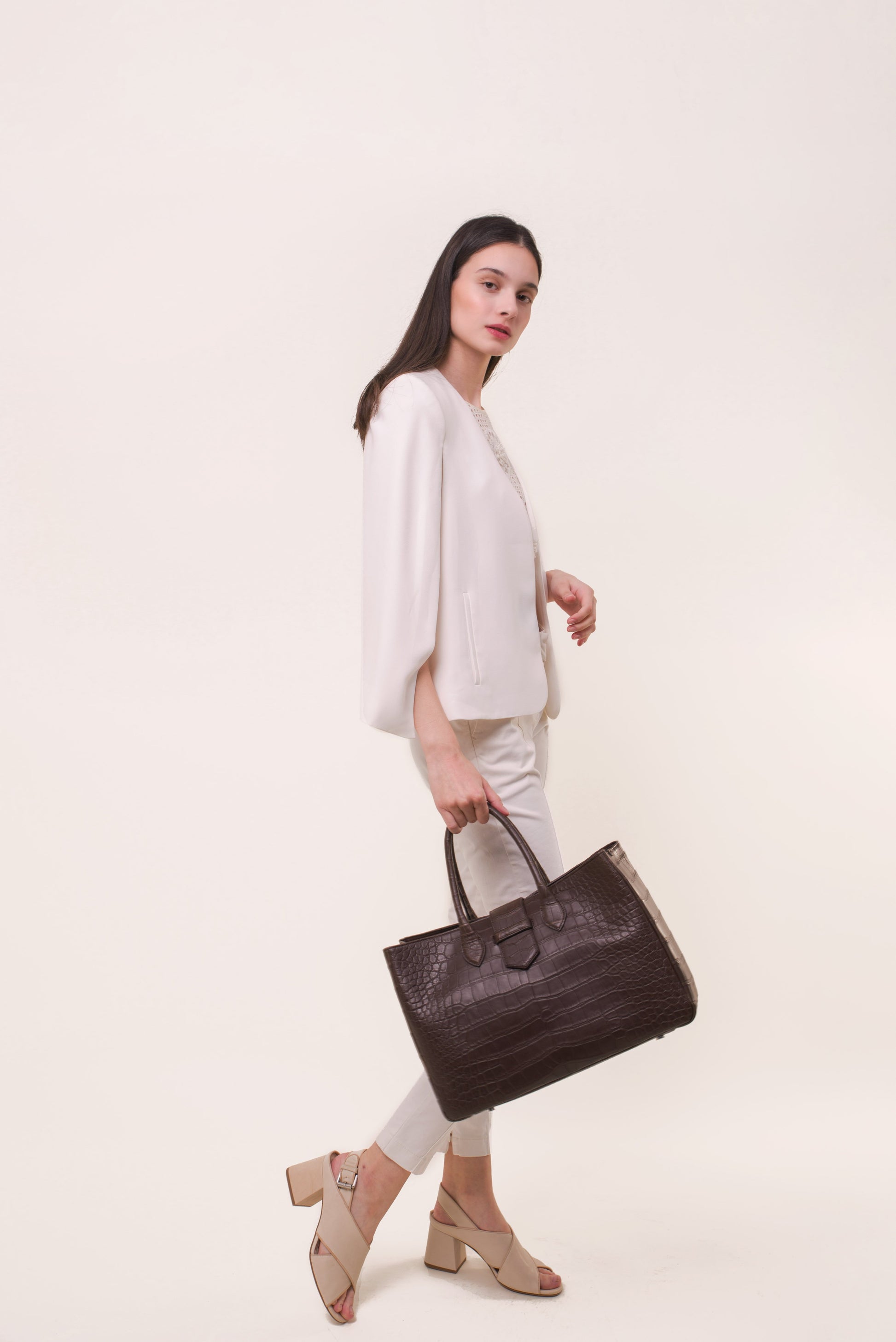 Camelia is a croc-embossed calfskin tote bag crafted by Biagini in Modena, Emilia-Romagna. Camelia offers 2 large compartments and plenty of smaller pockets. This sizeable tote is a total lifesaver for when you need a chic, yet practical accessory that can fit everything you need for a long day!