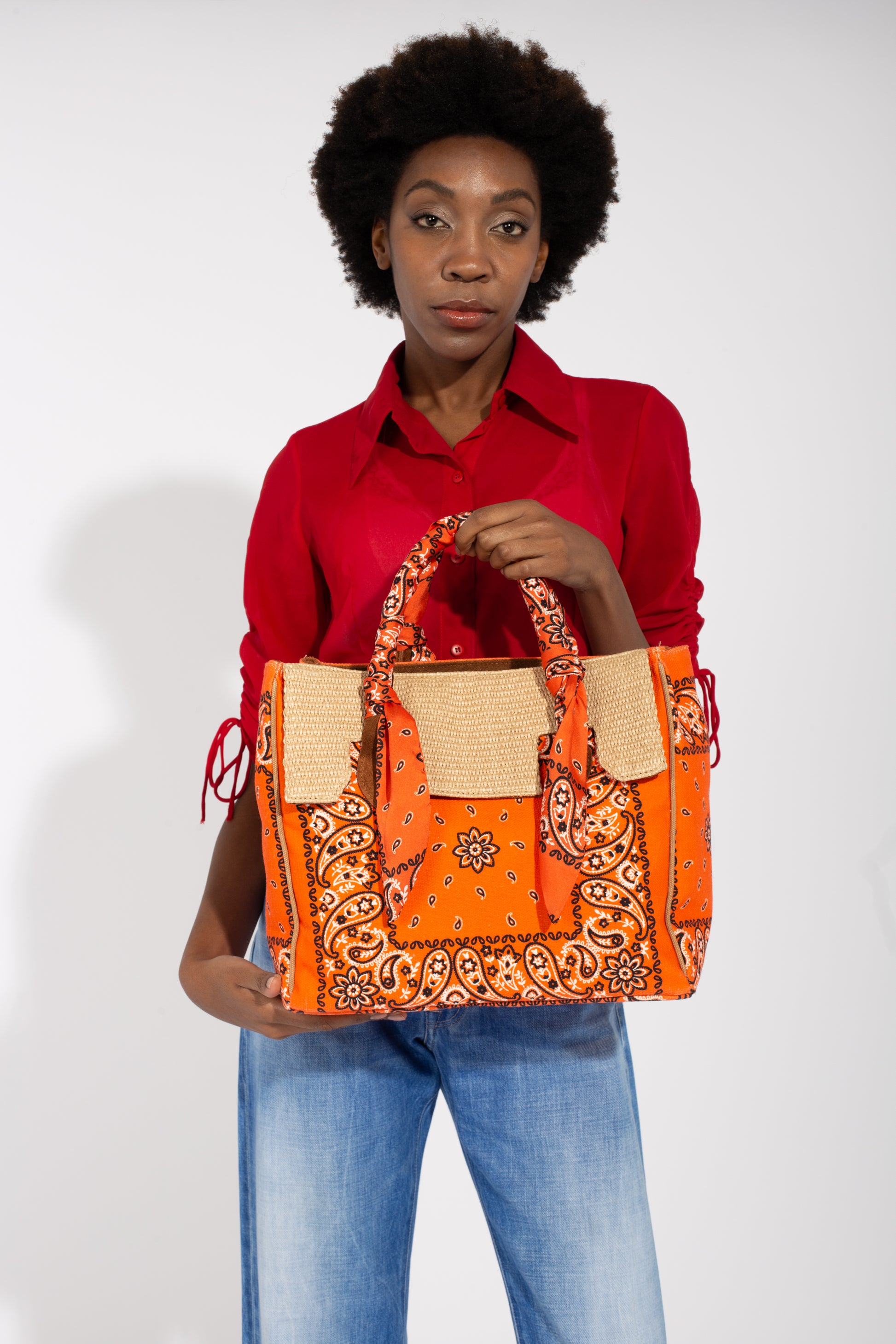 Chios Bandana is a top handle bag made in raffia and cotton in the workshop of Viamailbag in Tuscany.