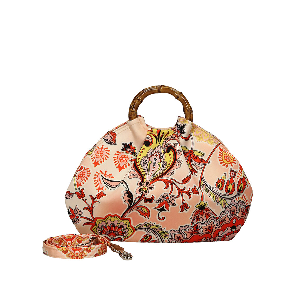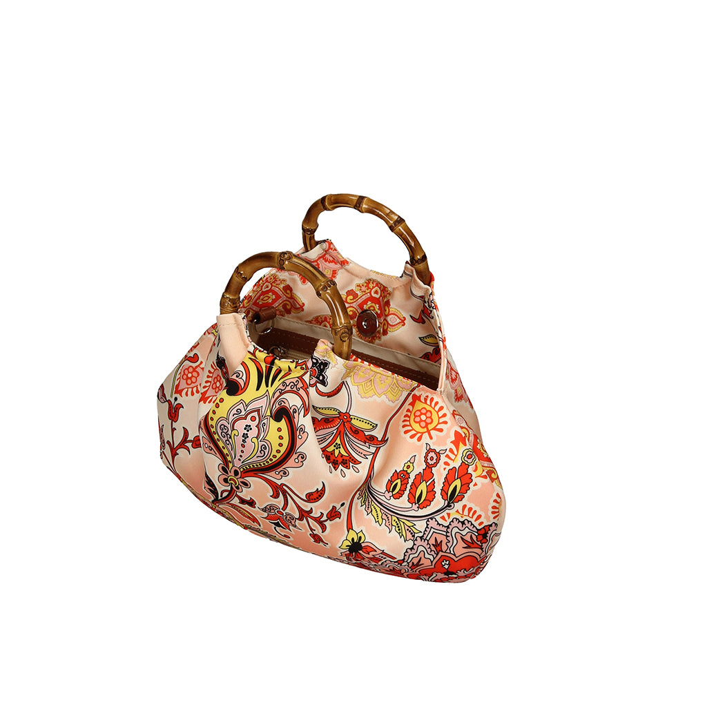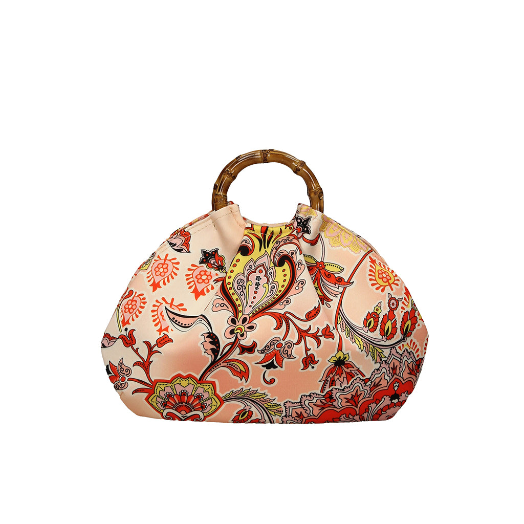 COROLLA PICCOLA is a round shaped mini handbag developed with a satin touch printed fabrics, calf trimmings and real bamboo wood handles.- 100% Made in Italy