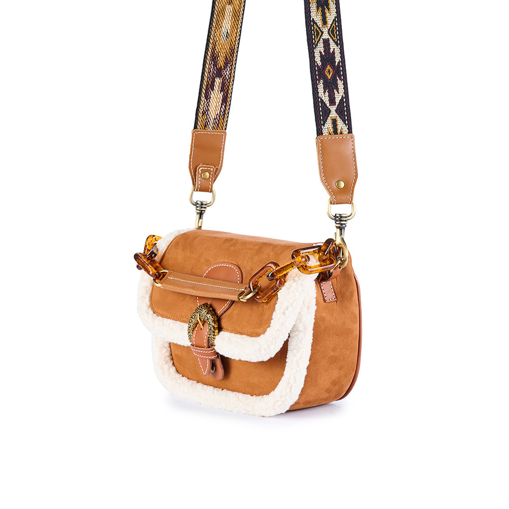 Cortina Suede is a crossbody bag composed of faux suede and eco-friendly faux fur made by Viamailbag in Empoli, Tuscany. The bag has leather details and patterned shoulder strap.