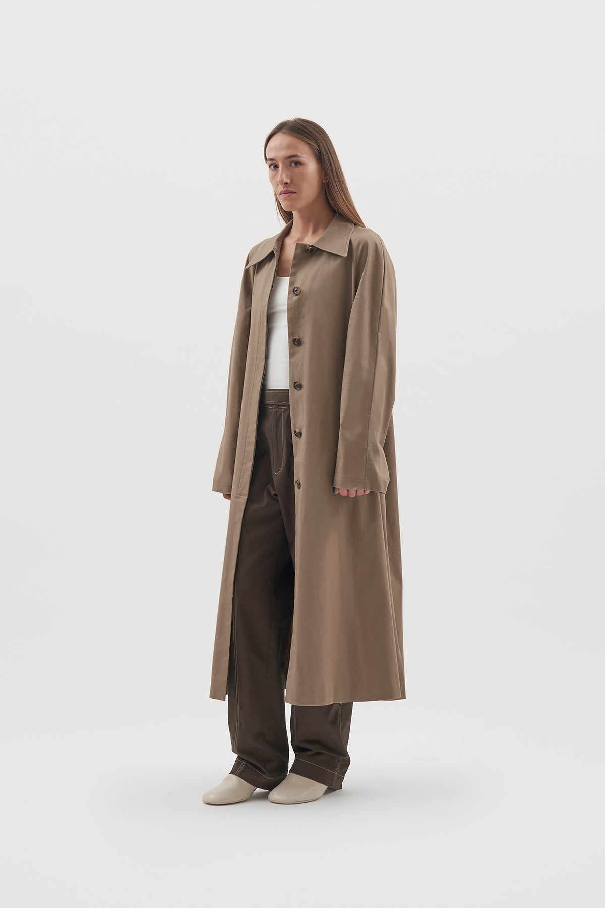 Raglan trench coat with gathers at back, composed of cotton made in Florence by Armonï Studio.