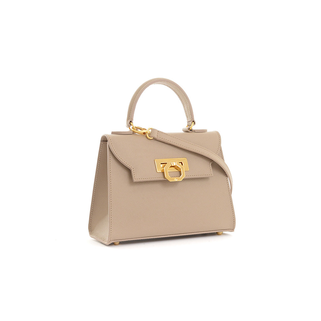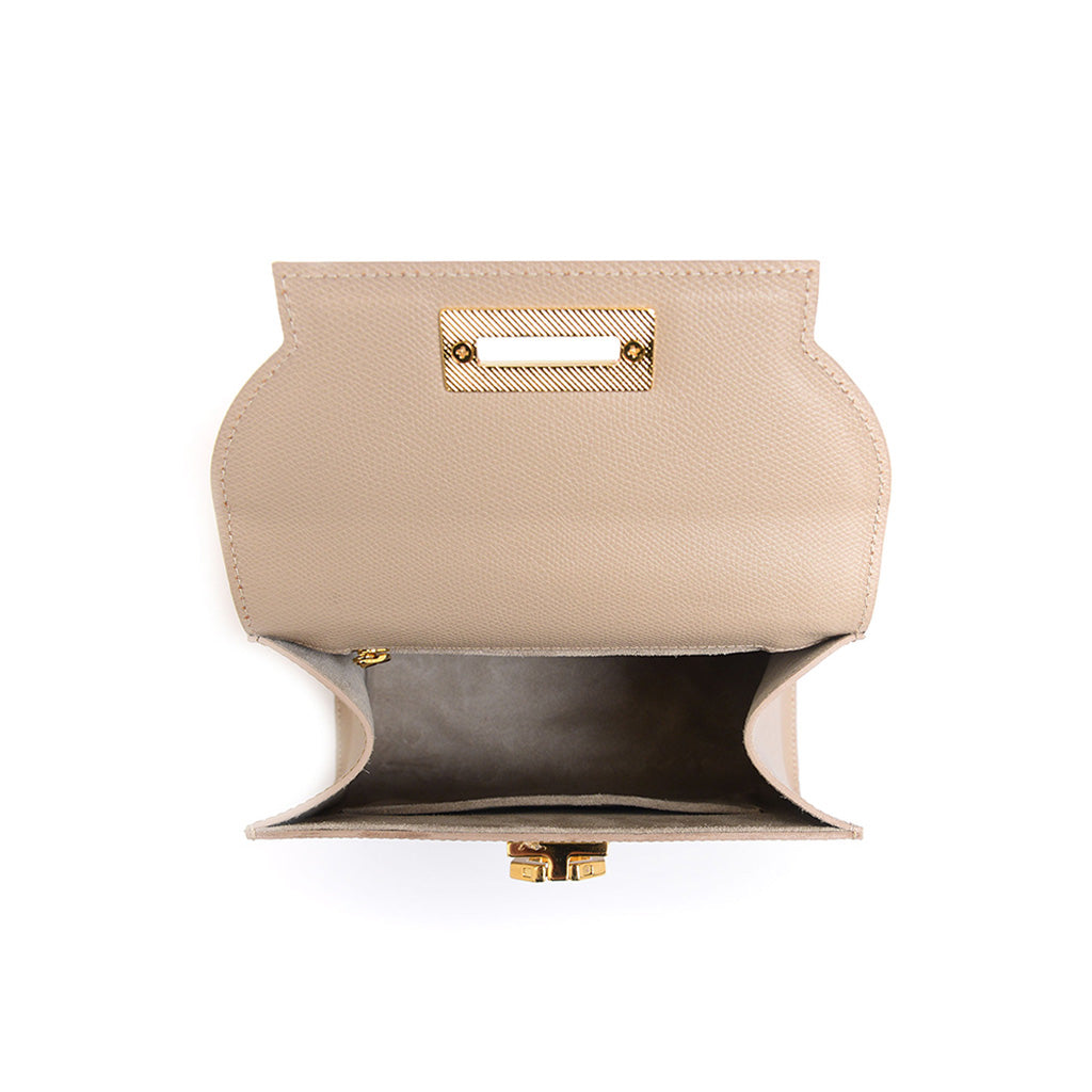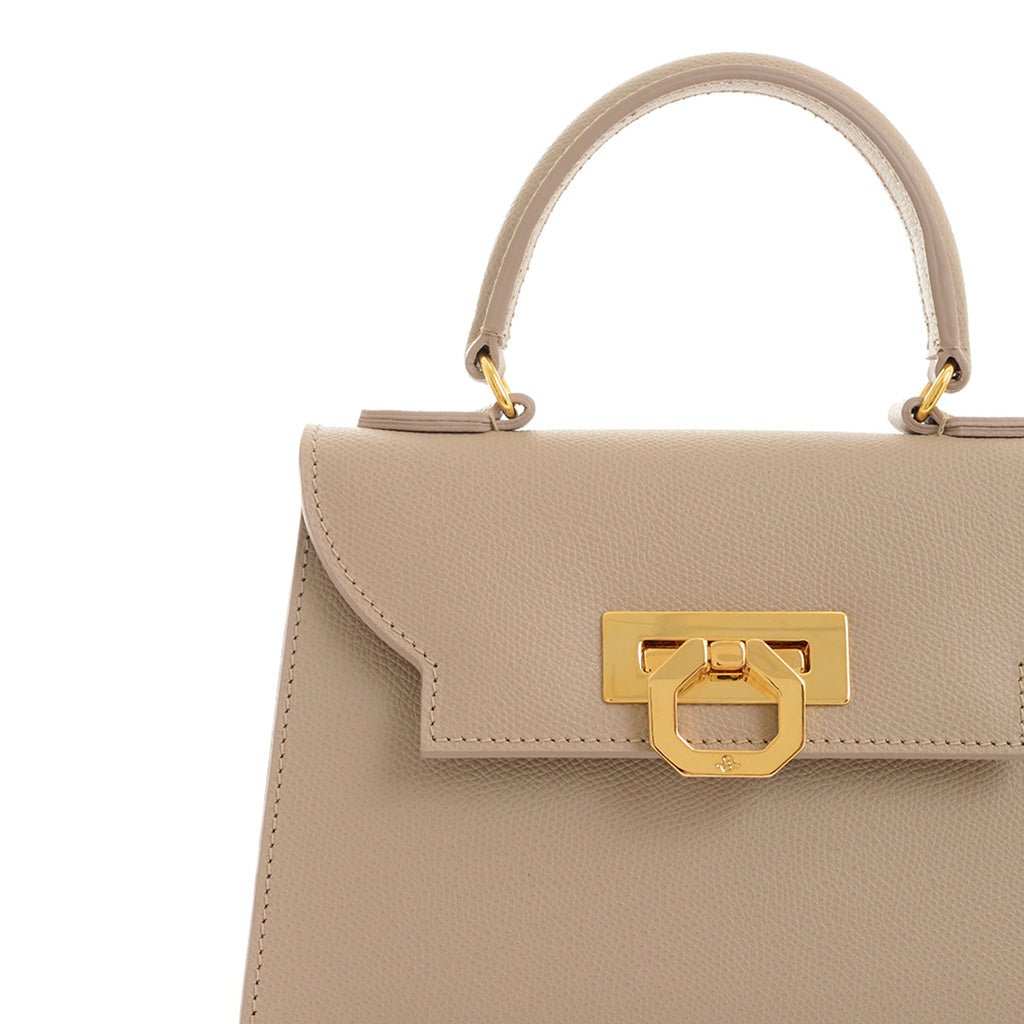 The bag is suede lined and comes with a detachable shoulder strap so that it can be worn either on the shoulder or crossbody. Erika will be packed with a personalized Carbotti bag, produced with 100% organic cotton. The new closure is made in gold-toned brass replicating the one designed by its founder, Domenico Carbotti, since 1960. It consists of “C” and “D” that build an octagon with engraved the distinctive “B” of the Carbotti brand