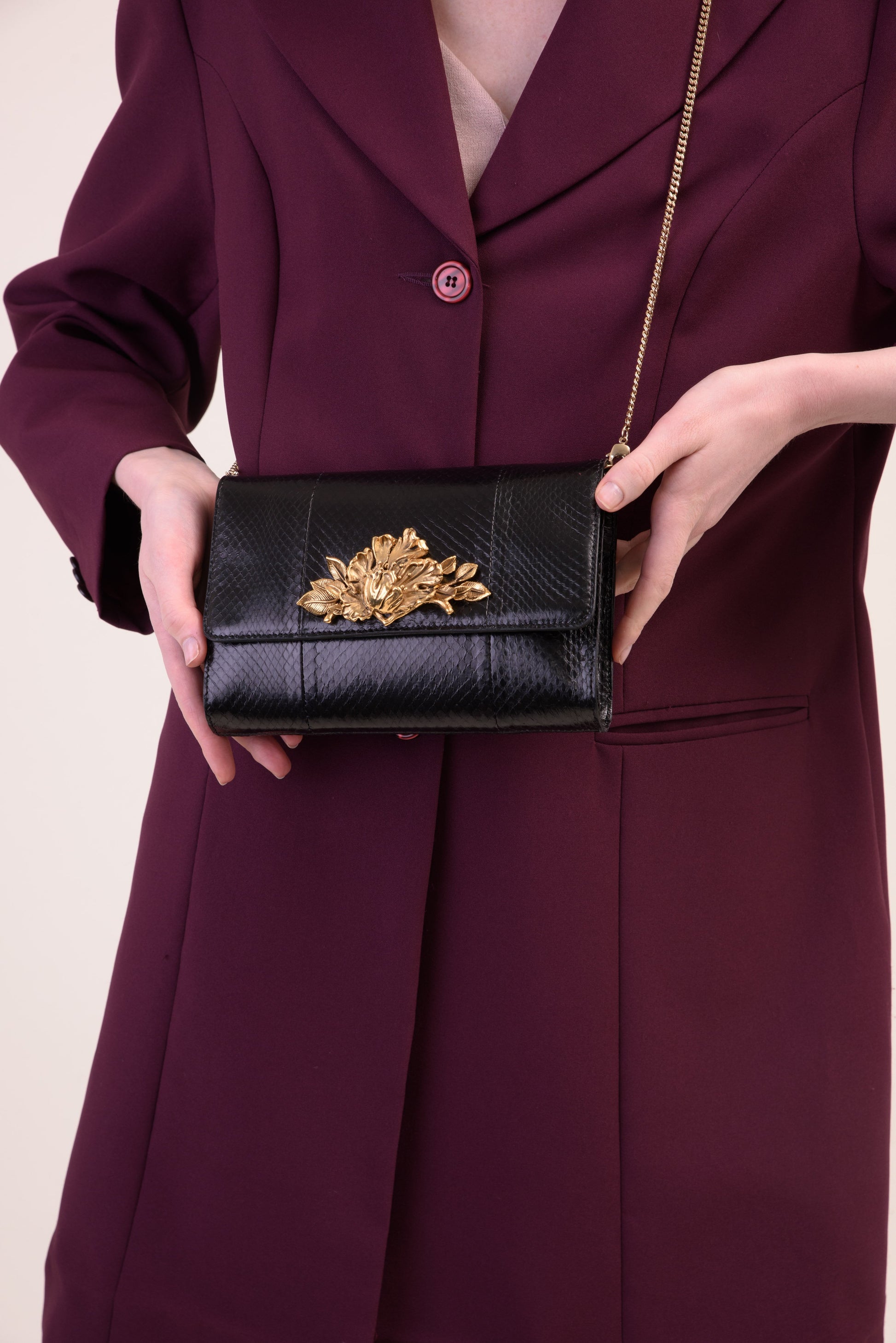 - Gold-toned hardware and brooch
