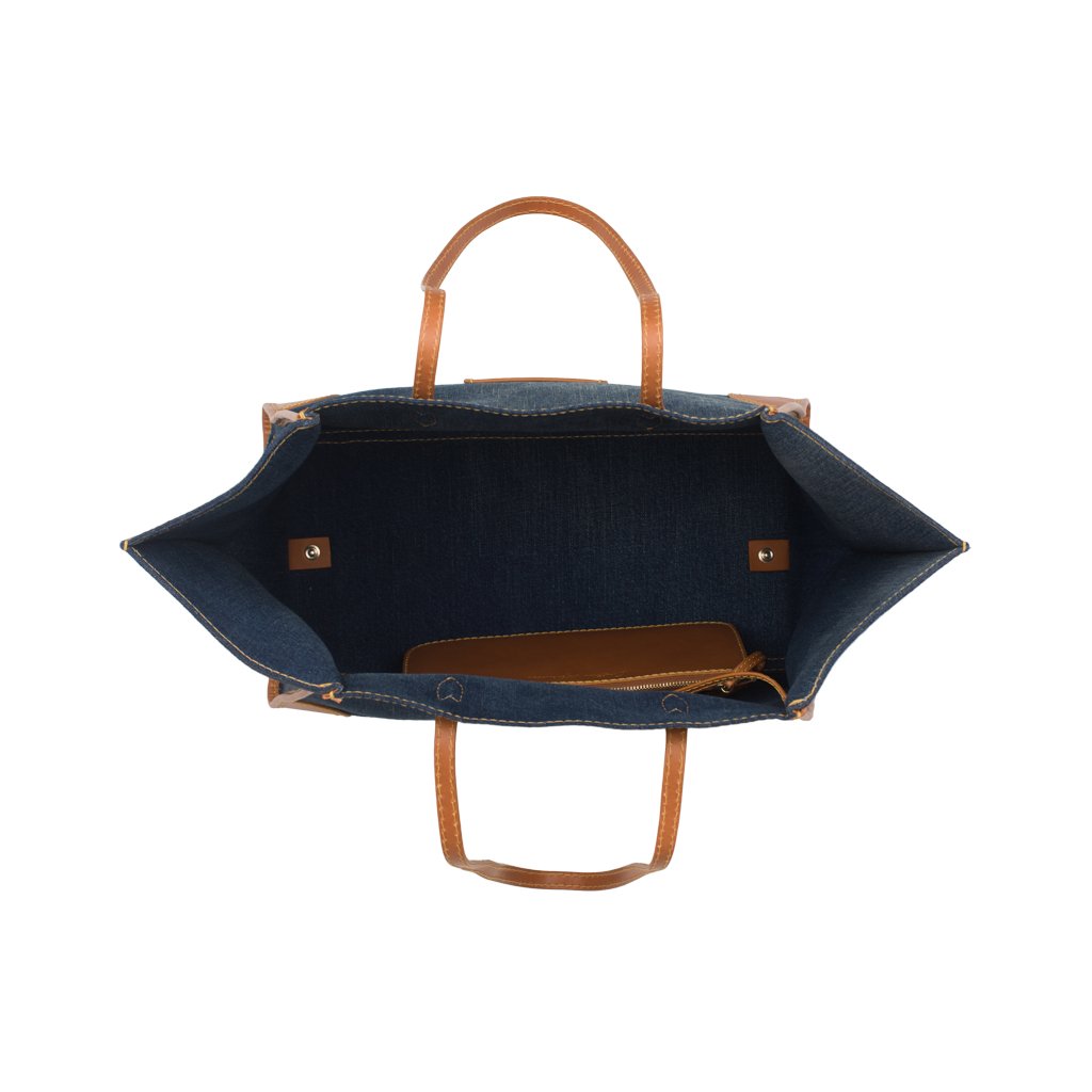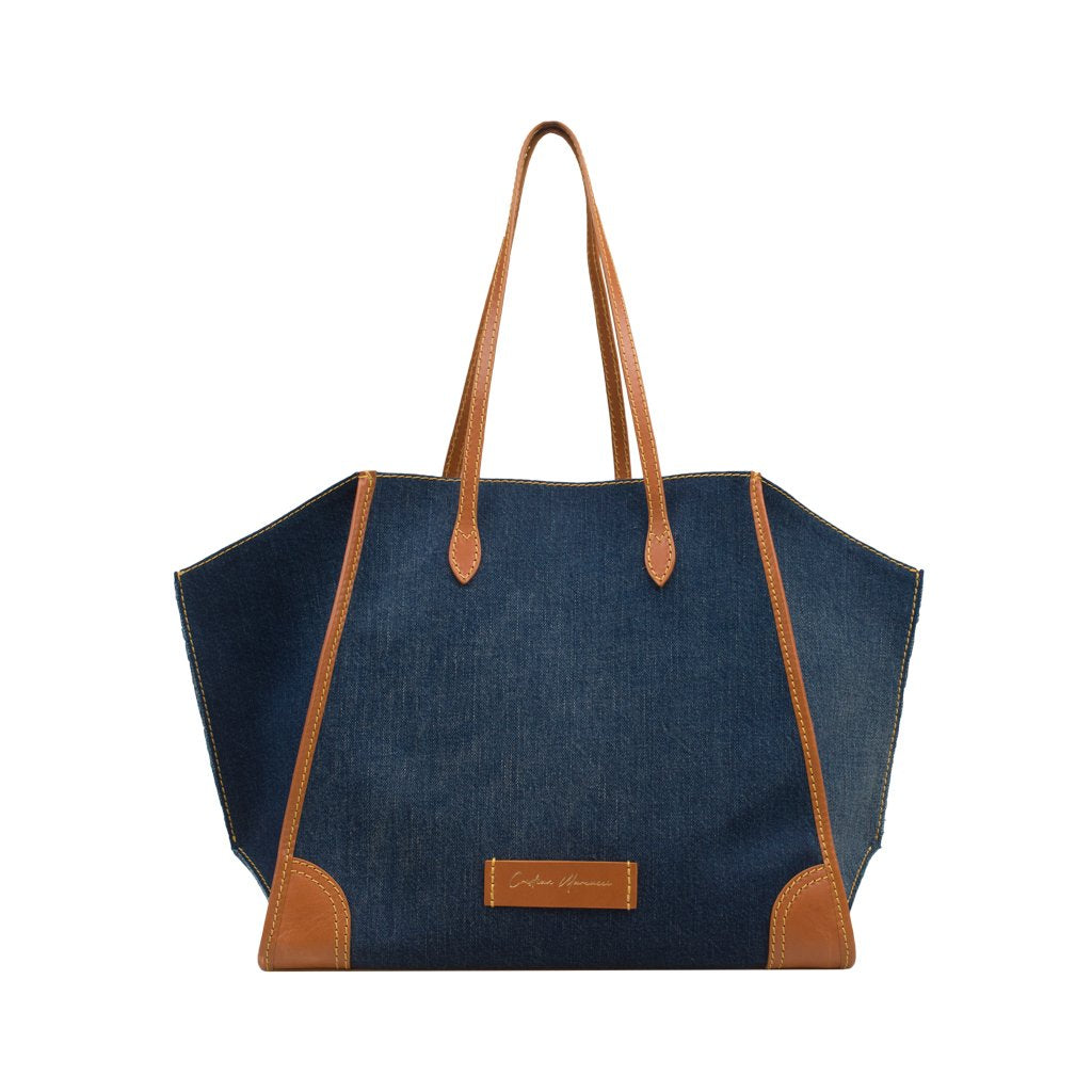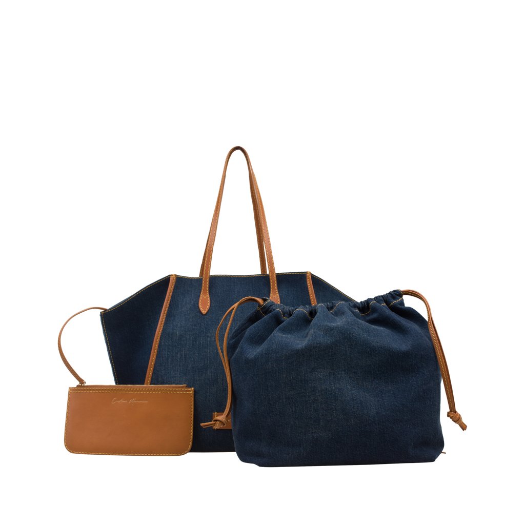 Gemma is a tote bag crafted by Cristian Marcucci. Made of cotton denim with calfskin details, Gemma boasts a super spacious lined interior and soft exterior. The perfect on-the-go tote, it's equipped with a detachable drawstring compartment and also a zipper pouch where you can keep your valuables.