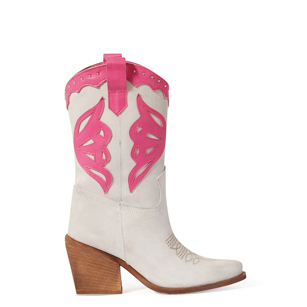 Jenna boots are made of genuine white leather with a fuchsia nubuck butterfly application. Perfect for those who want to be trendy.