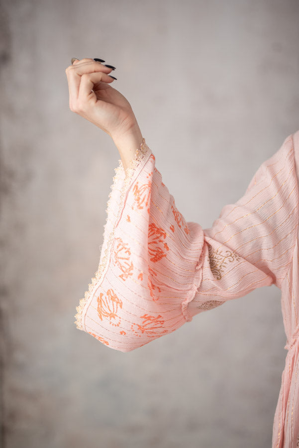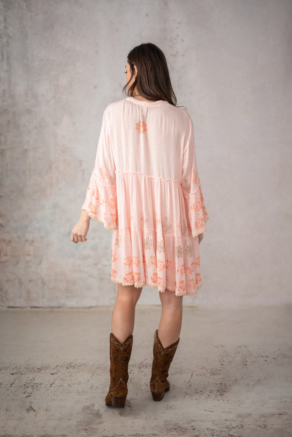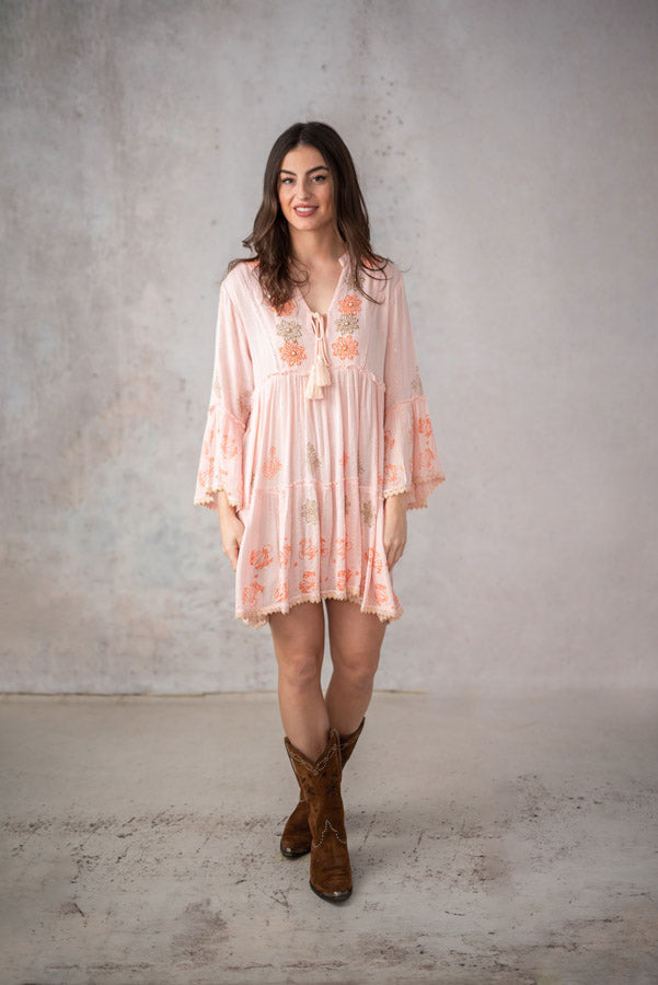 Short pink dress with V-shaped neckline made with geometric hand prints in different shades. Decorated with beads, trimmings and attached with cord finished in pompom. The sleeves are French sleeves finished with a beautiful ruffle. This garment is customized by the charm of shades. It is worked by a manual process that gives the garment a unique look. One size dress. Measurements; Chest width: 110cm, underbust 108cm, length 84cm and sleeve length 50cm.- Made in Spain