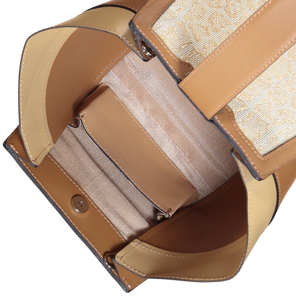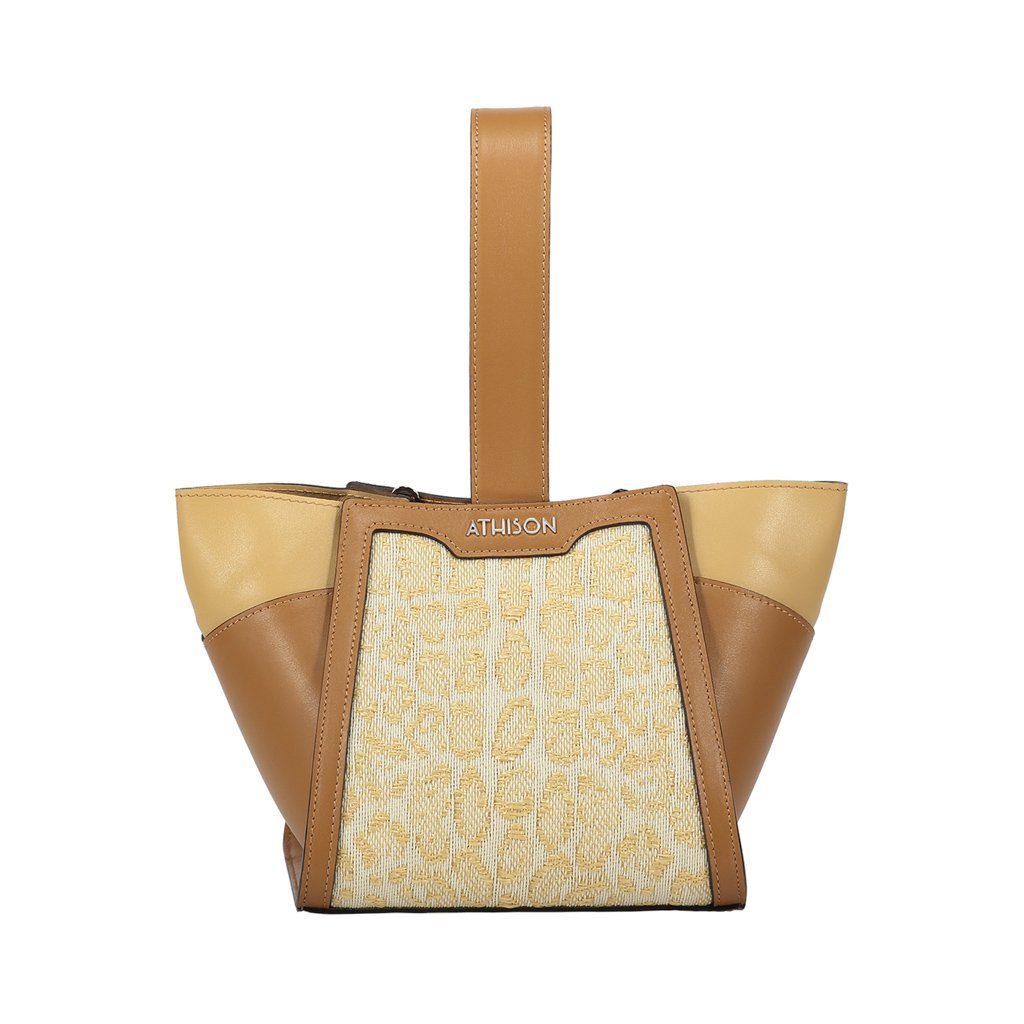 Masera is a top handle bag crafted by Athison in Villadossola, Piedimont. Designed by Giovanni, a young designer who won the 2021 Athison IntreccinCantiere talent contest, this cotton and raffia bag is characterized by a unique animal print made of 1056 woven threads. With vegetable-tanned leather details, Masera boasts a magnetic closure and an interior slip pocket. This bag comes with a practical detachable shoulder strap and thanks to its lightweight it can be easily worn on the wrist, making it a perfect partner for the whole week.