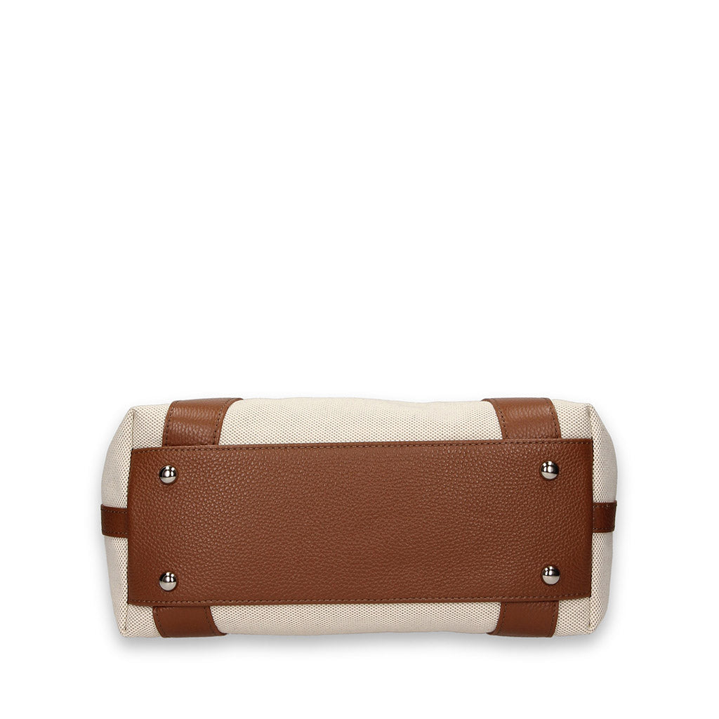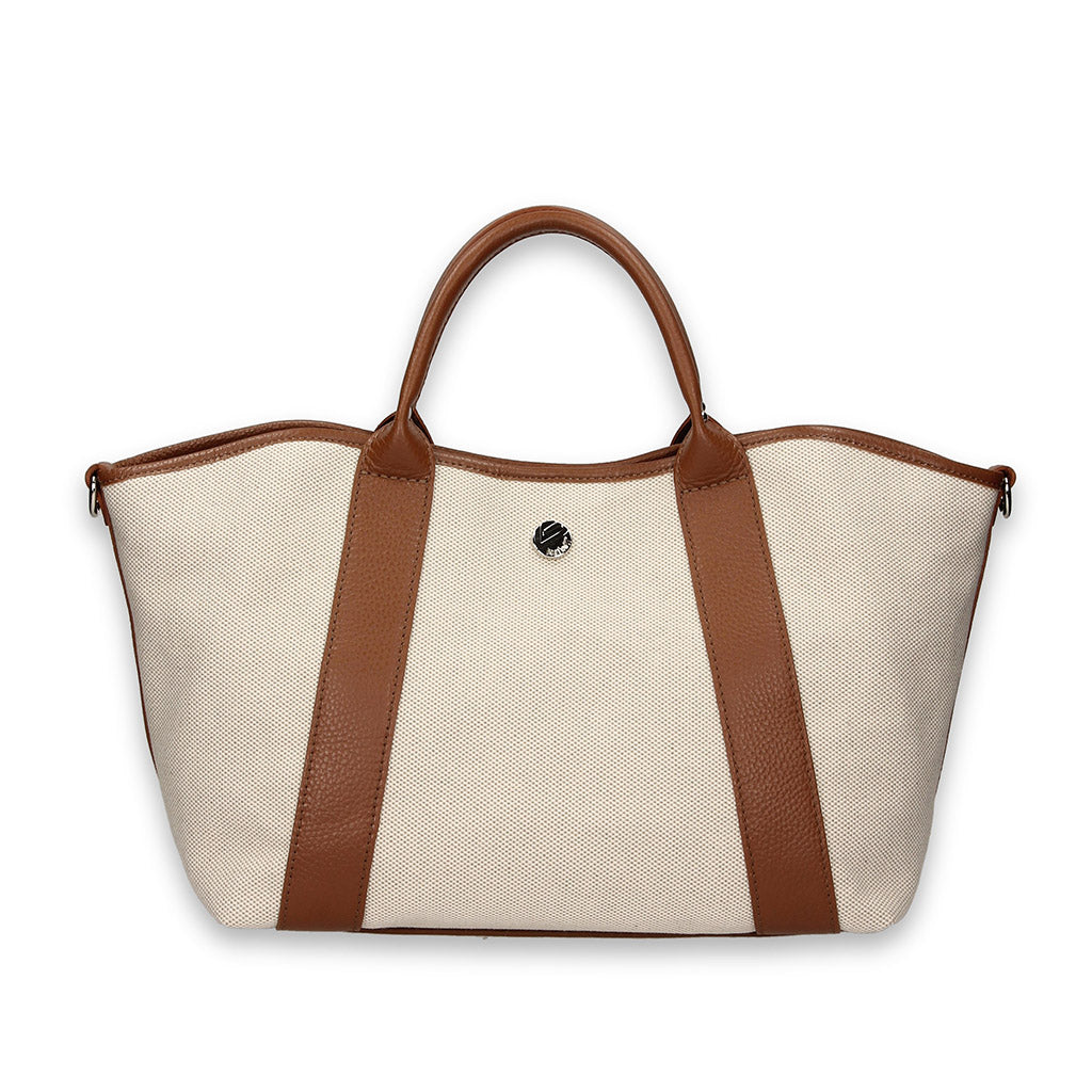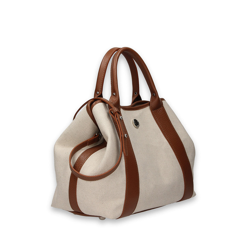 ONDA B is a flared 2- Way bag developed with the traditional Panama cotton canvas and calf leather trimmings- 100% Made in Italy