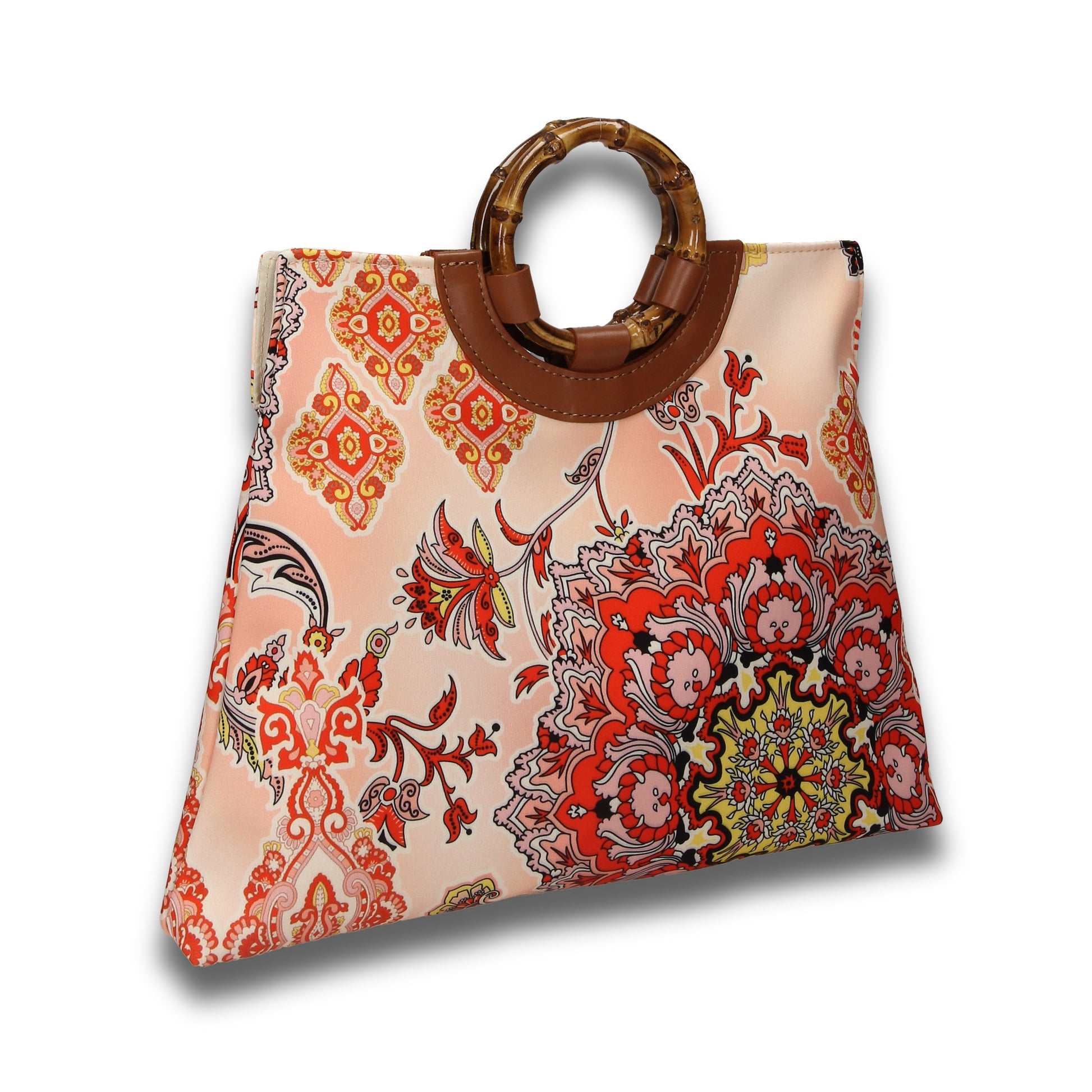 PAGODINA is a flared shaped handbag developed with a satin touch printed fabrics, calf leather trimmings and real bamboo wood handles.- 100% Made in Italy