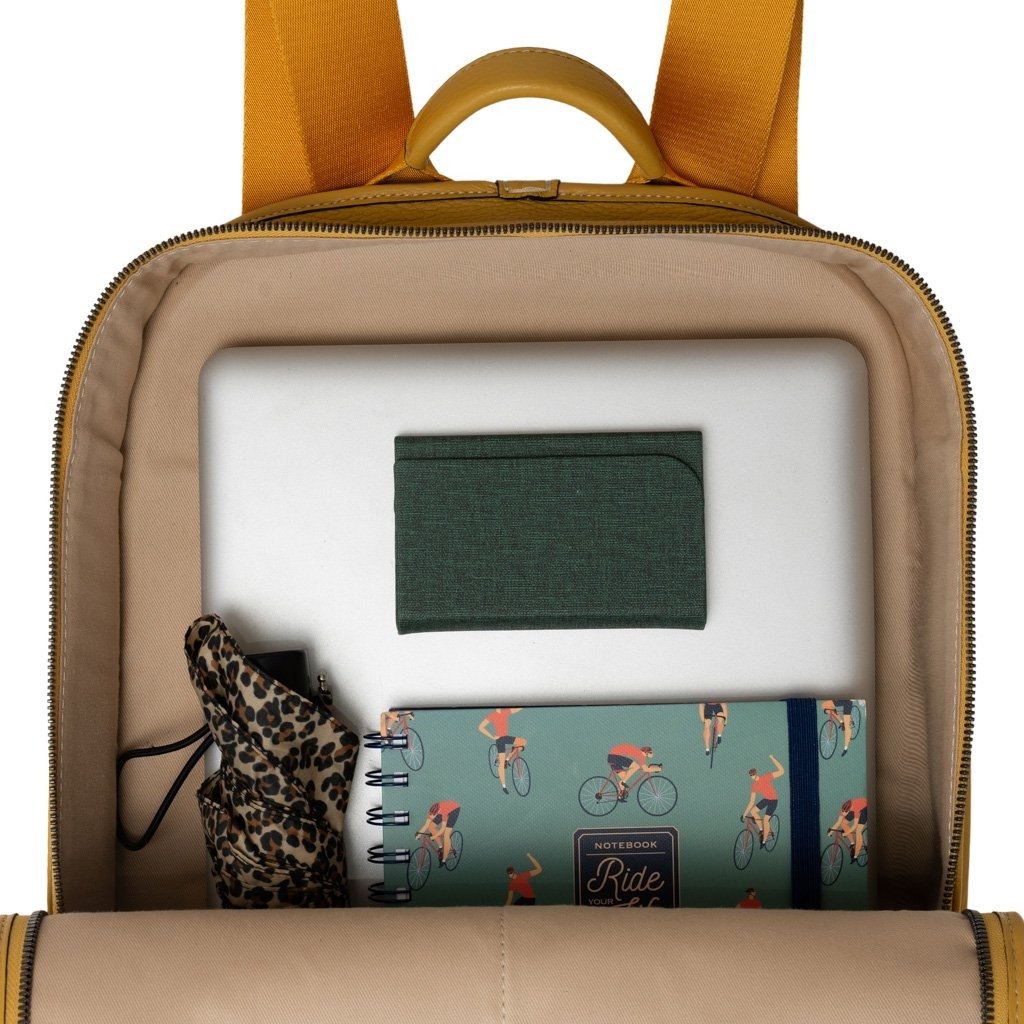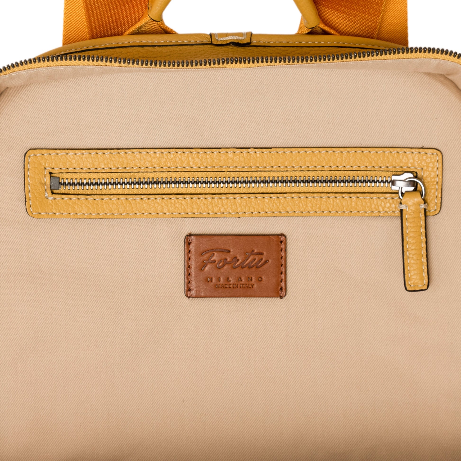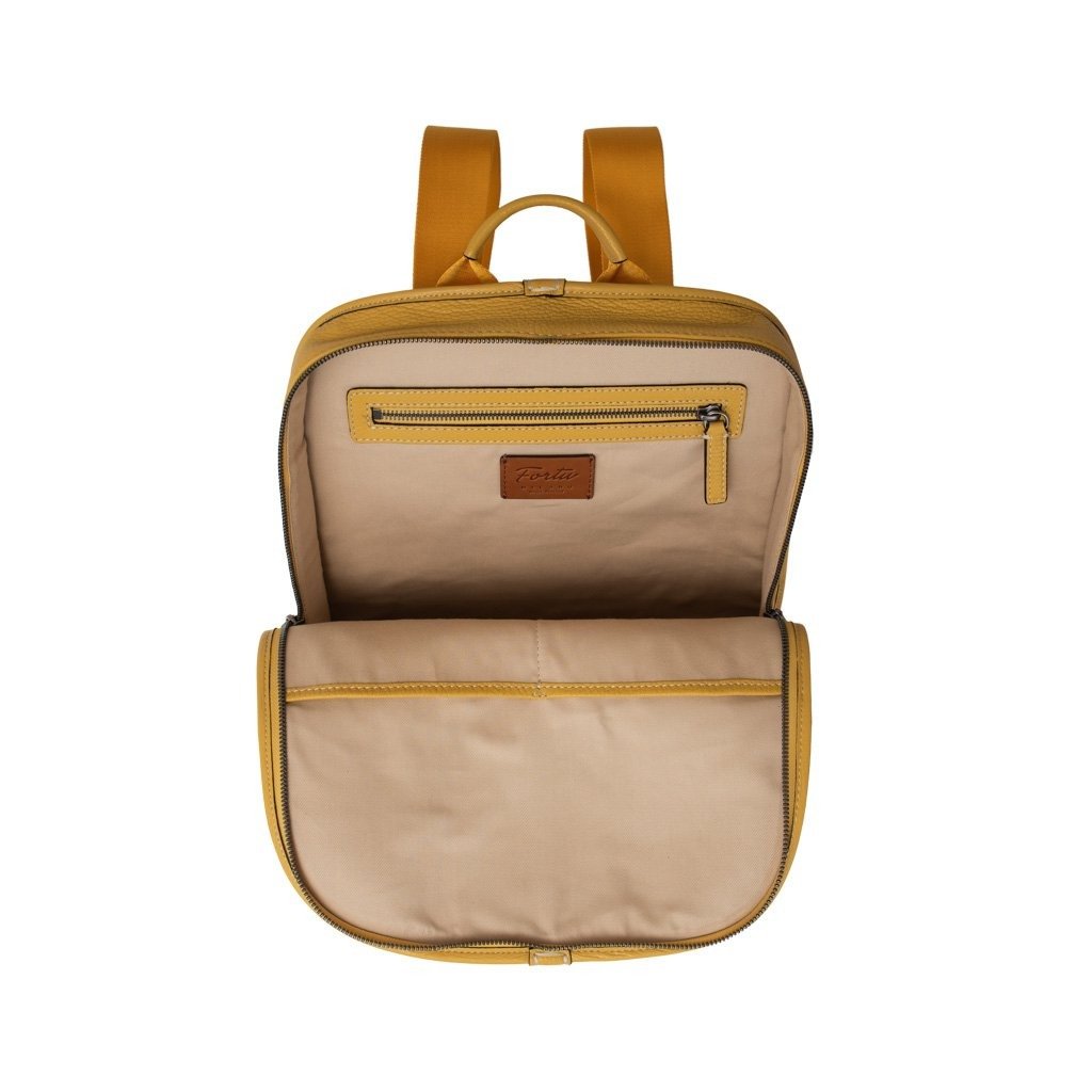 Raphael is a backpack crafted in the workshop of Fortu in Milan. Made of calfskin leather, it features a minimalist design that exudes sophisticated, understated style. In this yellow colour it takes on a sporty feel that makes it perfect for everyday wear and carrying your laptop and personal items with you, both when travelling and going to the office and around town. - 100% Made in Italy