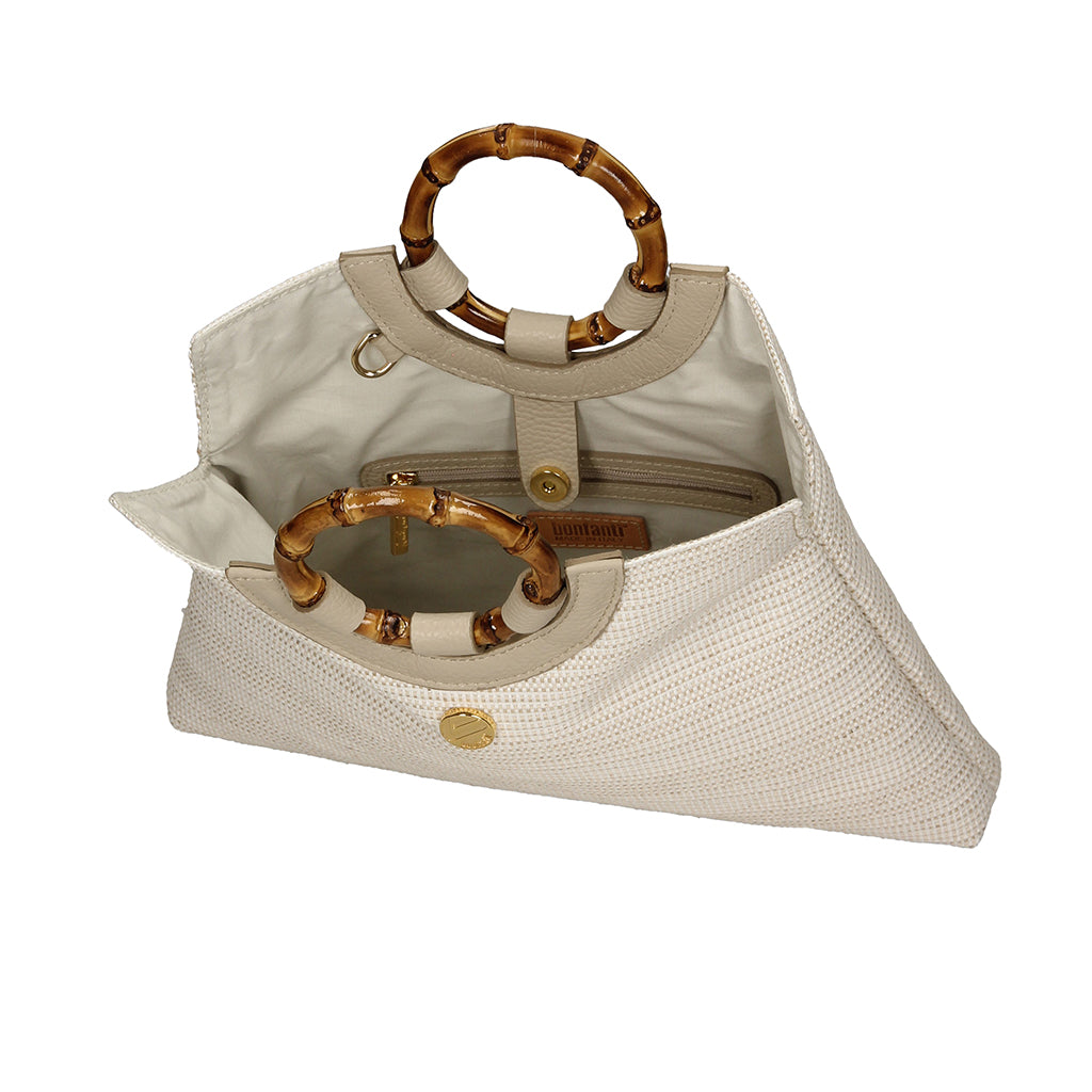 TRULLO PICCOLO is a flared shaped handbag made of raffia , calf leather trimmings and real bamboo wood handles.- 100% Made in Italy