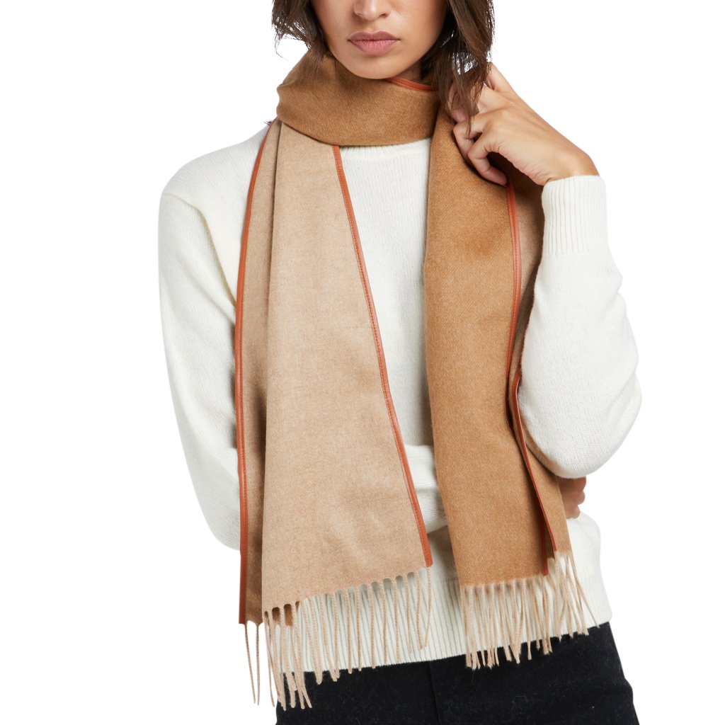 Vienna is a double-sided woven scarf by Doria & Dojola in Biella. Vicuña, known as the wool of the gods, is combined with cashmere to create a fantastic material feel at a more manageable price point. Bonus point for the stitched leather hem. - 100% Made in Italy